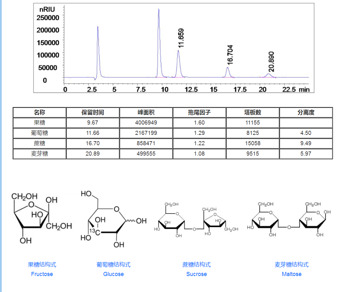 樣品:混合對照品溶液(30mg/mL果糖+24mg/mL葡萄糖+6.0mg/mL蔗糖+6.0mg/mL麥芽糖)